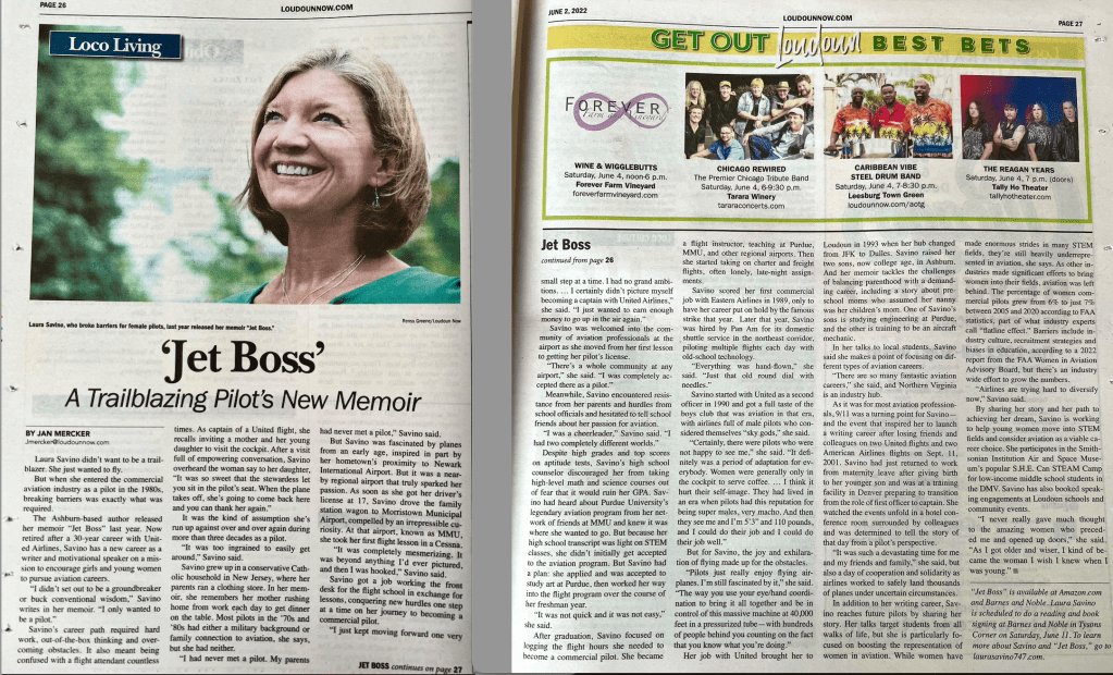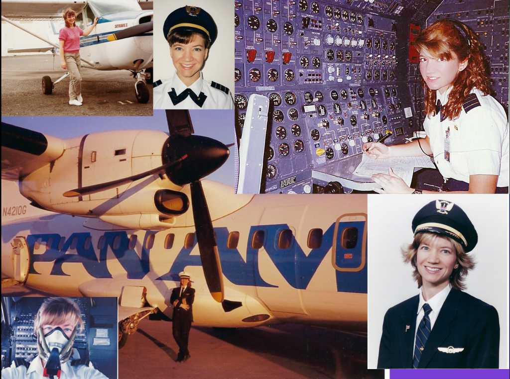 Girl pilot power! Theresa Claiborne, first black female Air Force pilot & fellow UAL captain – Donna Miller, AA captain – Laura Savino, UAL captain and author of JET BOSS – Caroline ‘Blaze’ Jensen, Air Force Thunderbird pilot – Heather ‘Lucky’ Penny, F-16 hero pilot on 9/11.