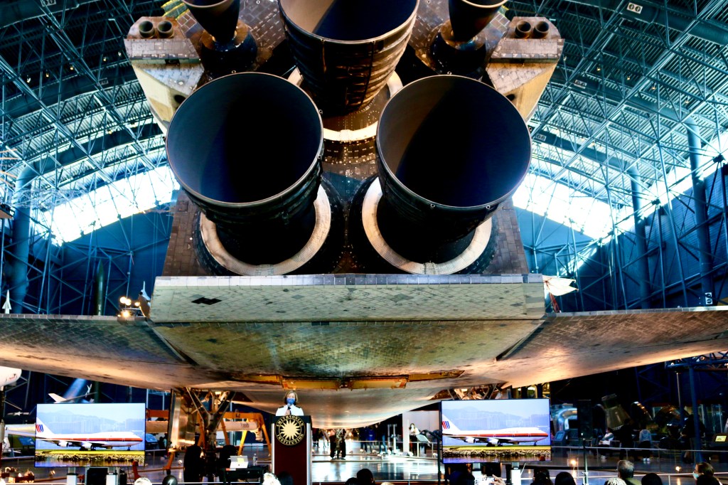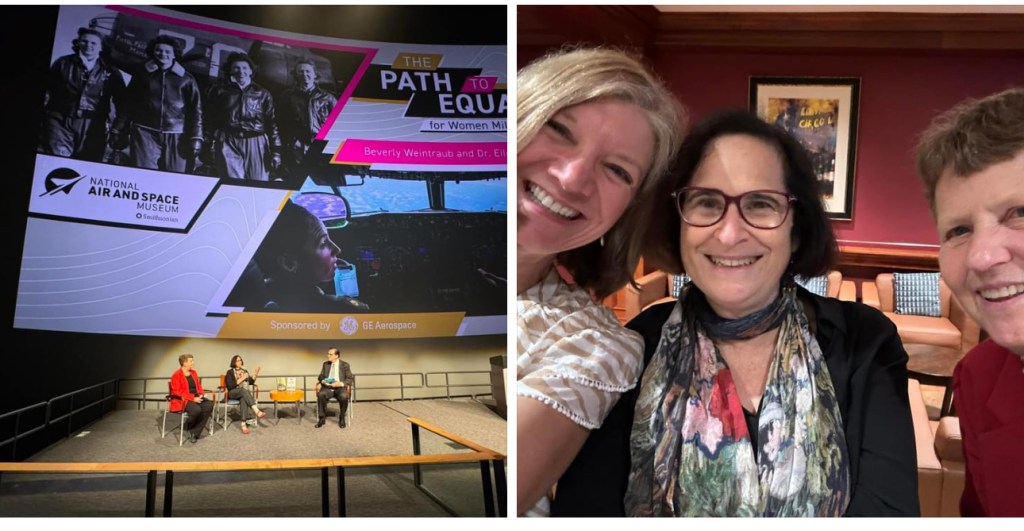 My amazing friends, Pulitzer Prize winner author and pilot Beverly Weintraub and Flight Test engineer, pilot and author Eileen Bjorkman – speaking at the Udvar Hazy Center, Smithsonian National Air and Space Museum.